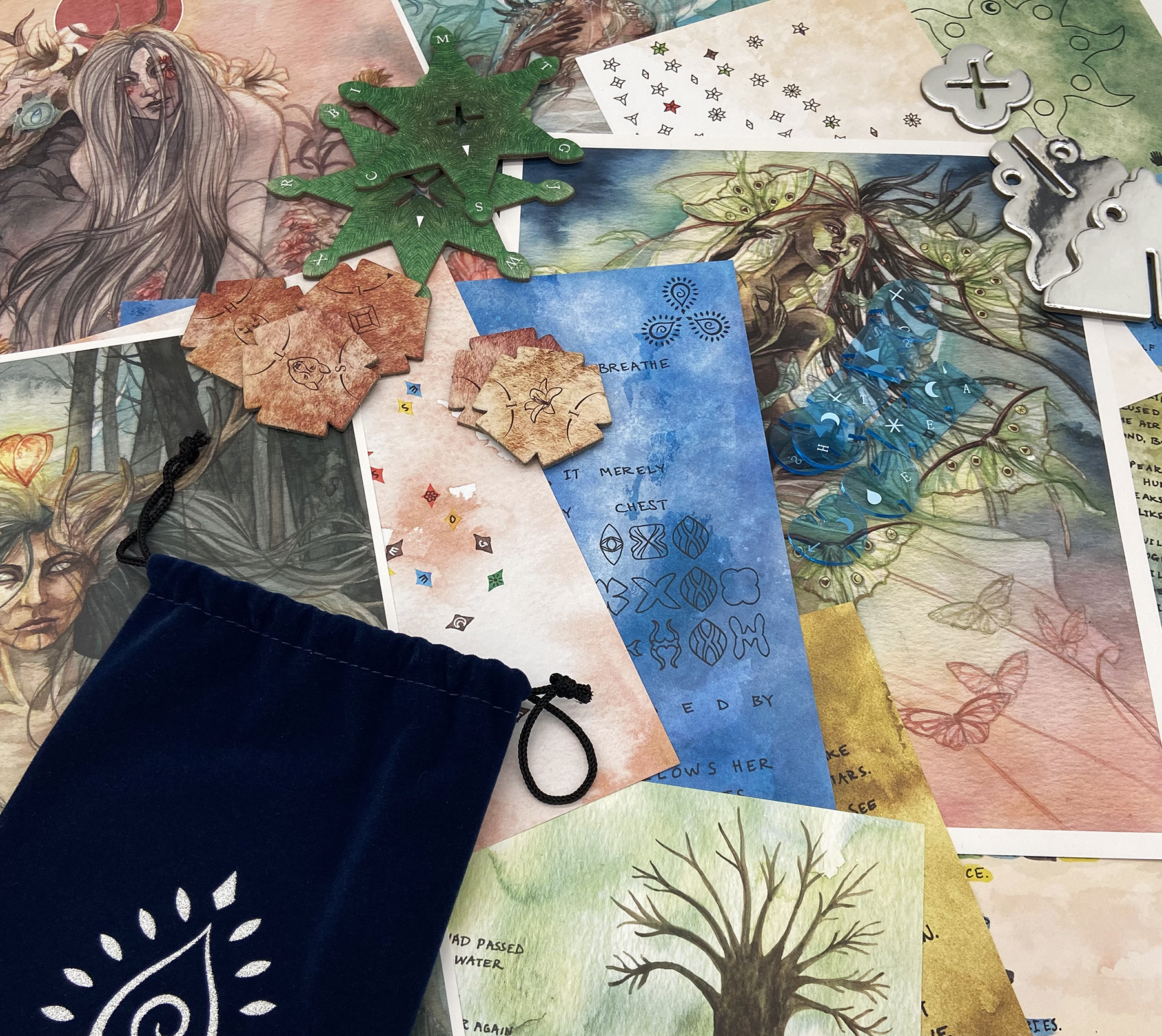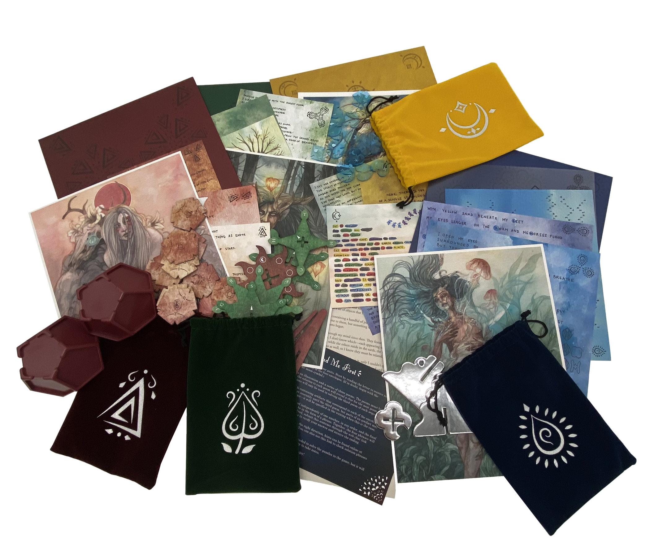 Adrift is played through four parts which can be completed in any order, each representing a different elemental spirit (Sky, Earth, Water, and Forest.) Each section of the game contains three sequential puzzles told through poems, an illustrated poster, and a physical item which needs to be assembled in order to derive a solution phrase.