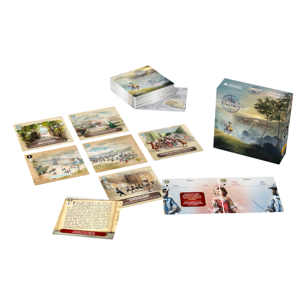 Cartaventura is a collection of narrative card games with an immersive storyline and multiple endings! Players build their adventure using cards that offer different options. Cartaventura offers games set in different eras, each one faithfully reproduced. Players are immersed in history thanks to rich scenarios and watercolor illustrations, in homage to travel books.