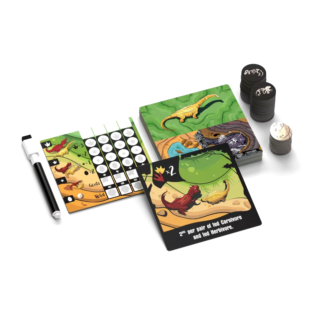 At the end of the game, each living and fed dino scores 1-3 points depending on its size, and the player with the highest score wins.