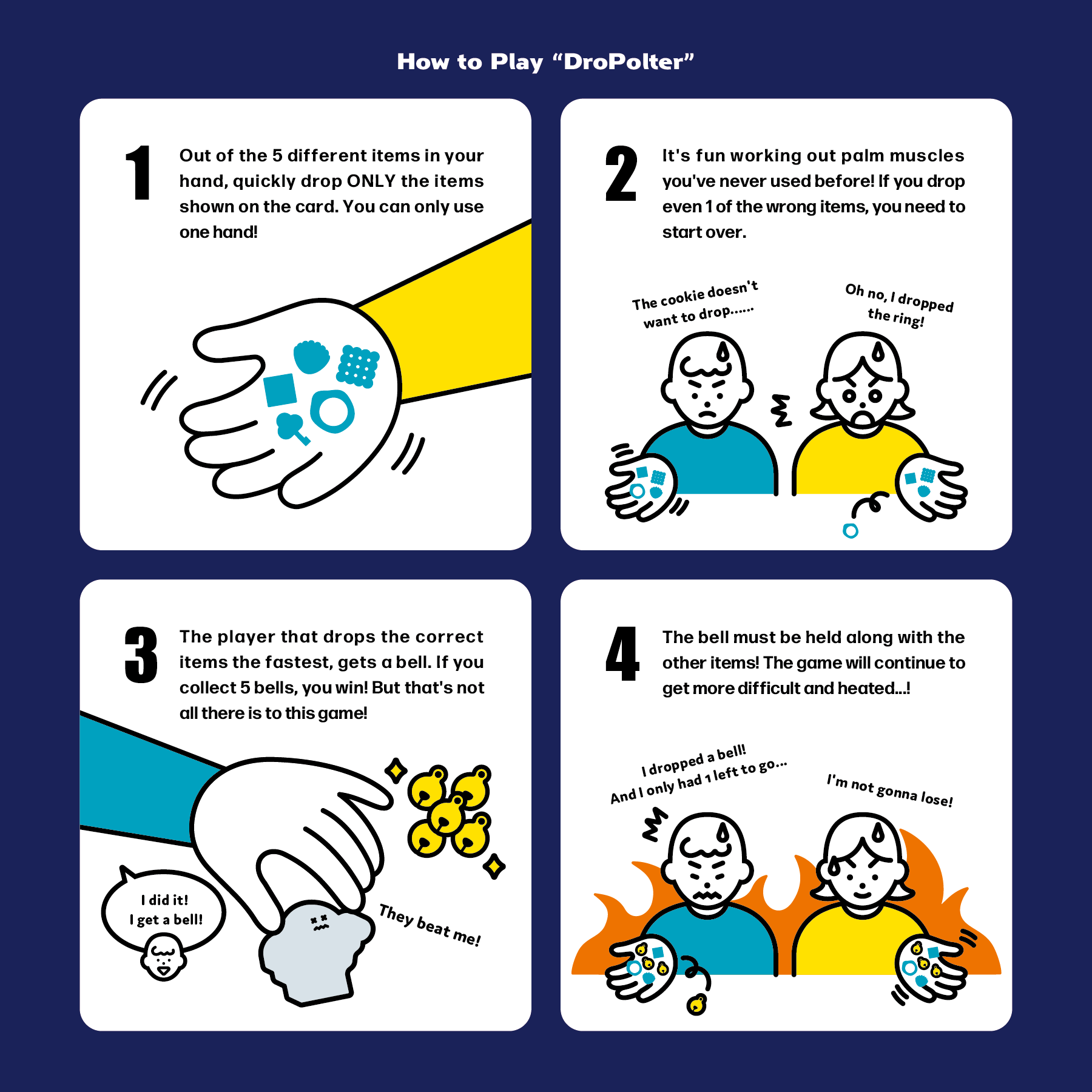 To start the game, each player has a hand of five items: a red plastic cube, a blue wooden key, and so on. Each round, someone flips the top card of the deck, then players race to drop only the correct items from their hand. If you drop something you shouldn’t, you’re out for the round. If you’re the first player who drops everything correctly, congratulations! You’re rewarded with a tiny bell…that is placed in your hand and cannot be dropped in the future.