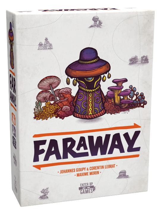 Each turn, you play a card from a hand of 3. Then you pick a new card from a face-up river. As play is simultaneous in Faraway, you must take into account a clever priority system in all of your choices – being last to pick a card leaves you with fewer options and often less profitable choices for the next turns.