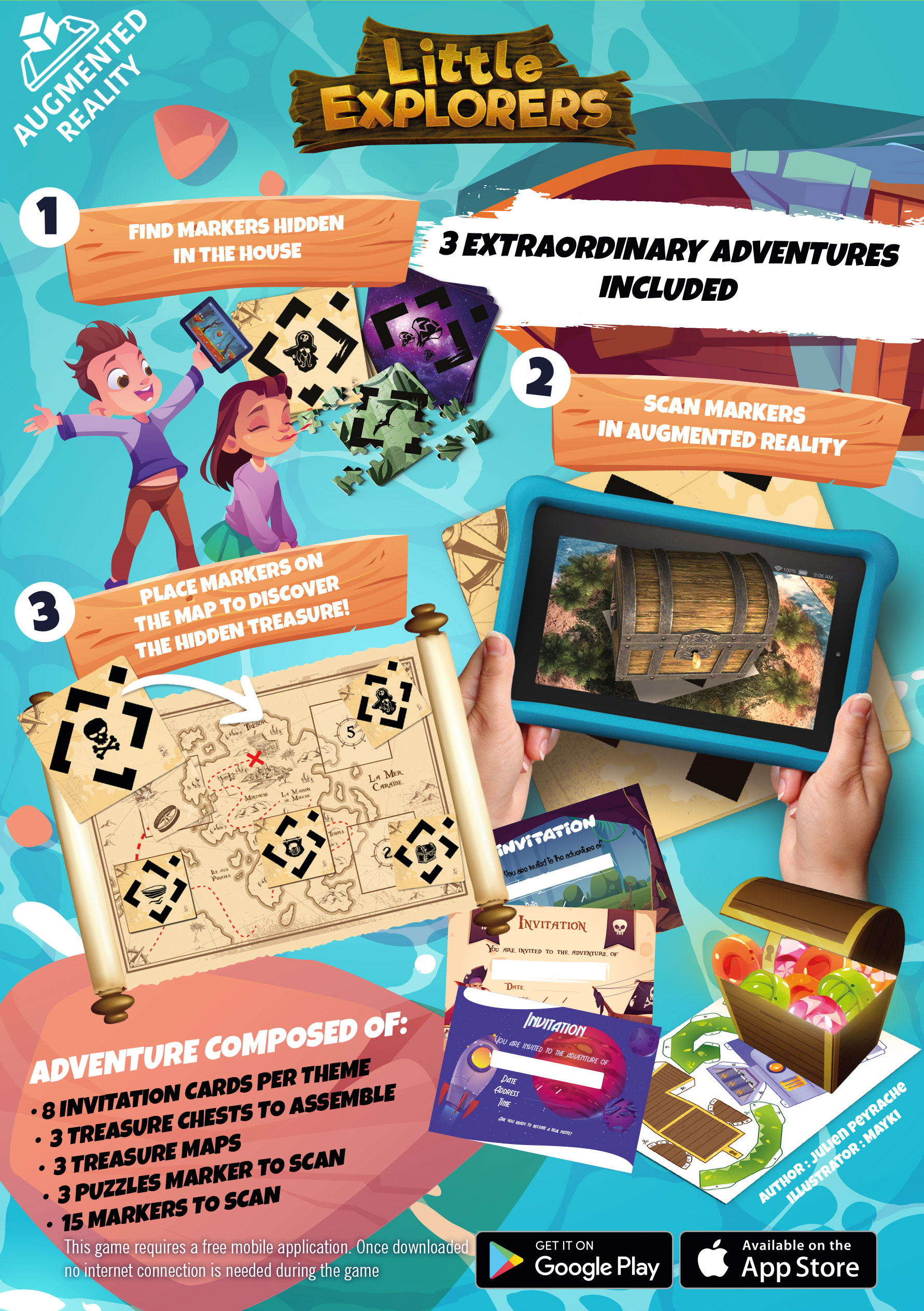 Little Explorers is the new treasure hunt in augmented reality! Once marker cards are hidden in the house, the hunt is launched! In teams of 2 per phone or 3 per tablets, adventurers look for the physical markers in the game area thanks to a digital treasure map in their possession.