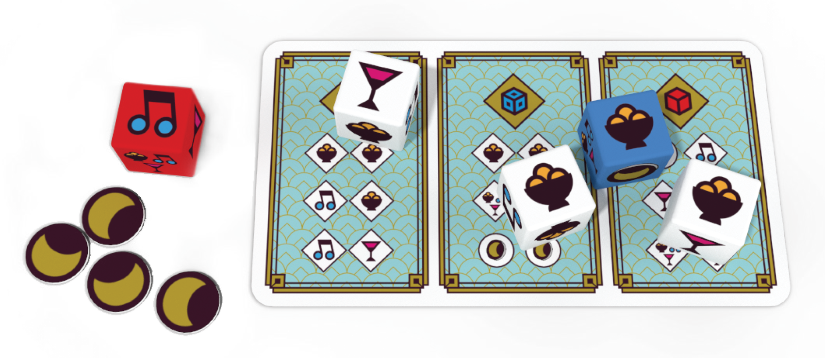 A game consists of a succession of rounds, all of which take place in the same way: first, the active player rolls – and possibly re-rolls – all the dice to which he has access, to validate a pool of dice. Each player then disposes of the resulting icons as they see fit. These icons represent prohibited resources prized by potential customers (each player has their own potential customers). By satisfying a customer’s specific needs, they enters the bar and benefits from the permanent bonus: prestige points, resource icons, access to other dice (blue and red dice), to raises, to other potential customers, etc. If ever a player doesn’t want to or can’t exploit the dice result, they is not stuck! They can either pick up a Moon token to place on one of their cards to unlock a temporary bonus; or replace one of their potential customers with a new one.