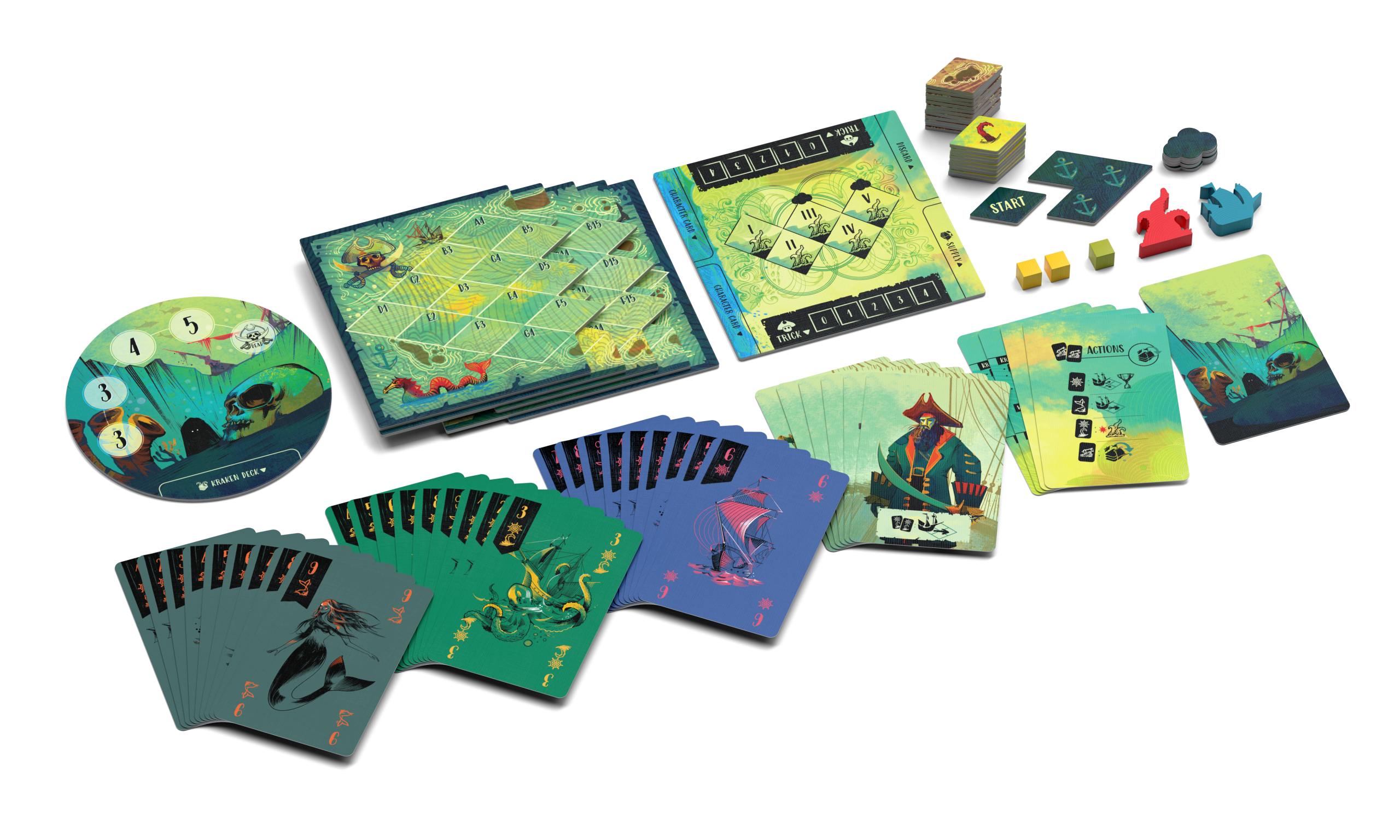 Before each round begins, players exchange cards, then play a series of tricks. Different game actions will be triggered depending on who wins each trick in combination with the unique character skills. However, the crashing sea water and the roaring Kraken make for a deafening situation, and players are unable to communicate about tactics and card information from the moment cards are dealt to the end of the action phase.