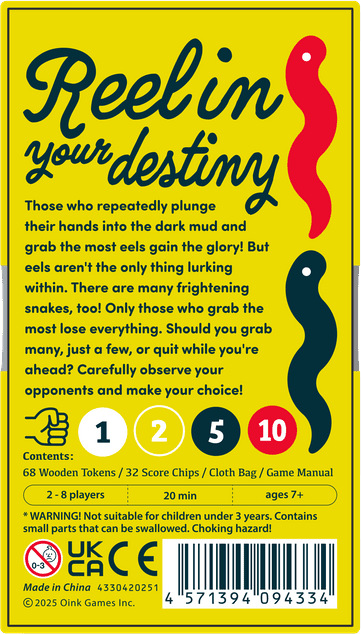 In Wriggle Roulette, players take turns reaching into a bag filled with eel- and snake-shaped wooden pieces, trying to pull out as many eels as possible — but if the number of snakes grabbed by all players exceeds the limit, a “snake outbreak” occurs, and the player who grabbed the most pieces loses all of their eels.